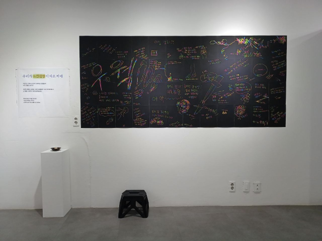 전시장을 들어서기 전, 유리벽에는 무지개빛 메시지들이 띠처럼 둘러져 있다. 201명의 피해 당사자들이 보낸 응원의 말들이었다. 화사는 <케이팝 데몬 헌터스>에서 악령을 막아주는 '혼문'을 떠올리며 '무지개 혼문'을 만들었다고 했다. 그것은 단순한 전시 입구 장치가 아니라, 상처를 지닌 사람들이 서로를 맞이하며 보듬는 돌봄의 문이었다. 전시장으로 들어서면 가장 먼저 전시의 취지를 알리는 글이 관람객을 맞이한다. 더 이상 침묵하지 않고 연대하여 목소리를 내겠다는 선언이었다.