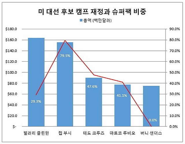 셋째, 샌더스의 '실탄', 즉 풀뿌리들이 헌금한 정치 자금이 상상외로 튼튼합니다. 샌더스가 주장하는 '정치 혁명'의 핵심 중 하나가 미국의 정치 자금 모금 제도를 확 바꾸자는 것입니다. 즉 부자와 대형 은행들이 슈퍼팩을 통해 자신들의 '허수아비(Puppet)'인 정치인을 당선시키는 현행 제도 대신에 민초들이 소액을 기부하여 정치 자금을 조성하도록 하자는 것입니다. 이번에 샌더스는 이 같은 방법으로 놀라운 성과를 거두고 있습니다. 아래 표를 보면, 힐러리는 총모금의 30% 정도가 슈퍼팩에서 옵니다. 반대로 샌더스의 경우는 슈퍼팩의 헌금이 제로(0)입니다.