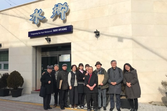 한상 차리고 둘러앉으니 호스트이자 ‘로컬가이드’ 장 선생을 비롯한 동행인들에게 비로소 눈길이 간다, 우선 이번 여행에 동행해 주신 고등학교 절친 김창희와 최만섭 선배. 동아일보 기자 출신의 김창희는 앞에서 언급했듯이 노회찬이 김정숙 여사에게 선물한 책 <아버지를 찾아서>의 필자. 월남한 아버지가 일찍이 통영에 정착한 덕분에 그도 통영에서 태어났으니 이번 여행은 고향방문을 겸하는 셈이다. 통영 시내 구경 도중에 지금은 다른 건물이 들어선 본인의 ‘생가터’(?)에 들러서 부모의 통영 시절을 추억하는 짠한 장면을 연출하기도 했다. 최만섭은 노회찬이 고교시절부터 노동운동시절까지 수없이 옮겨다닌 자취방을 거의 다 가봤을만큼 가까운 사이였다. 그 시절 노회찬이 정성을 다해 끓여주던 자취방 라면 맛을 아직도 잊지 못한다. 절친들 옆에 이번 통영기행을 마련한 음식천국 기획자인 노회찬재단 김형탁 사무총장, 박규님 운영실장이 계시다. 중간쯤에 이상희 님이 자리를 함께 했다. 통영음식 연구가이기도 한 이 선생은 통영 강구안에서 멍게요리전문점 ’멍게가’를 운영하고 있다.