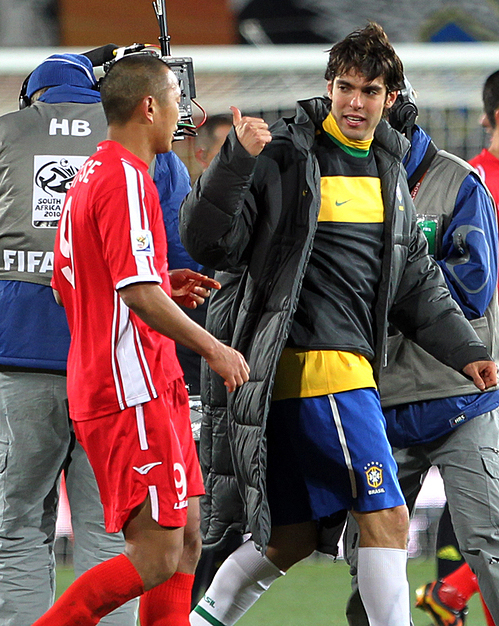 | ▲16일 오전(한국시간) 남아프리카공화국 요하네스버그 엘리스파크에서 열린 2010남아공월드컵 브라질과 북한의 경기에서 브라질 카카가 경기가 끝난 뒤 정대세에게 엄지를 들어보이고 있다. ⓒ연합뉴스 |