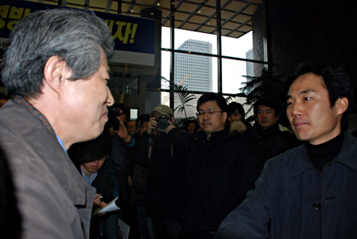 ▲ 지난 해 2월 MBC를 떠나기전 이근행 당시 노조위원장과 악수하고 있는 엄기영 전 MBC사장ⓒPD저널 |