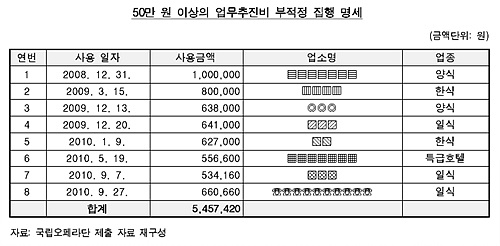 본인의 신용카드는 공연사업비까지 끌어다 막고, 업무추진비에서 사용하도록 돼 있는 직원 등에 대한 축의금, 조의금은 엉뚱하게 복리후생비에서 끌어다 썼다.