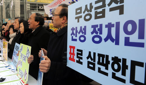 | ▲ 전면무상급식 실시에 반대하는 단체들이 주민투표 서명을 받고 있다. ⓒ뉴시스 |