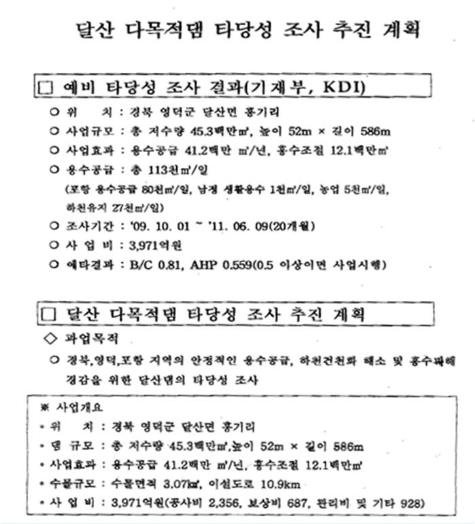 즉 이 사업은 이명박 정부 들어서 추진된 사안이다. 실제로 정부는 2009년에 사업 추진 계획을 세우고 예비타당성 조사를 시작했다. 그리고 2010년도 예산안에 달산댐 사업비가 반영됐다.