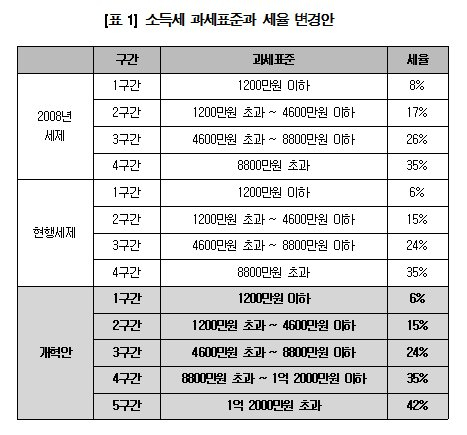 한편 소득세법 개정안은 내년부터 적용되는 과세표준 8800만 원 초과에 대한 감세를 하지 않으면서, 동시에 과세표준 '1억2000만 원 초과'(5구간)을 만들어 42%의 세율을 적용하자는 안이다.