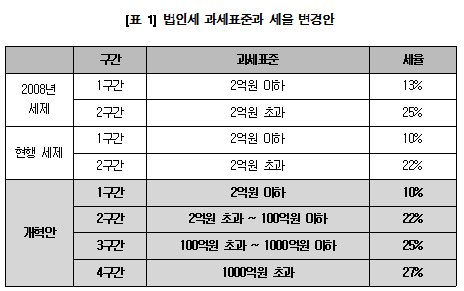 참여연대가 이날 내놓은 법인세법 개정안은 현재 2구간인 과표구간을 4구간으로 세분화해서 과세표준 100억 원 이하인 중소기업에는 이명박 정부에서 단행한 감세 혜택을 그대로 두고, 과세표준 '100억 이상 1000억 이하'(3구간)와 '1000억 원 초과'(4구간)를 새로 만들어 각각 25%와 27%의 세율을 적용하자는 것이다.