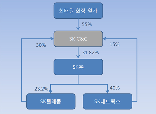 대신 최 회장은 SK C&C 지분의 44.5%를 보유하고 있고 SK C&C는 SK㈜ 지분의 31.82%를 가진 최대주주다. 회장의 동생인 최기원 씨가 보유한 SK C&C의 지분 10.5%까지 합치면 SK C&C는 총수일가에게 장악된 셈이다.