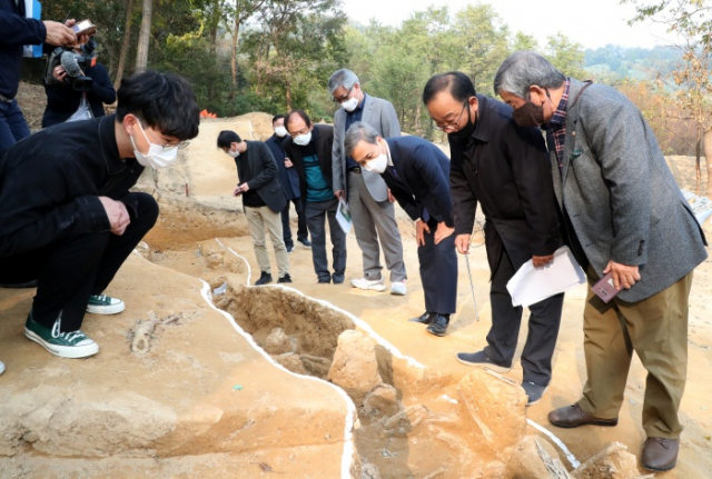 한국전쟁 당시 억울하게 희생된 전북 전주지역 민간인 희생자들에 대한 유해가 황방산에서 추가로 발견된 28일 황방산 발굴조사 현장에서 김승수 전주시장과 김건우 전주대학교 박물관장, 자문위원, 유족회원 등 20여 명이 참석한 가운데 '한국전쟁 민간인 희생자 유해발굴 조사결과 중간보고회'를 개최하고 현장을 살펴보고 있다.