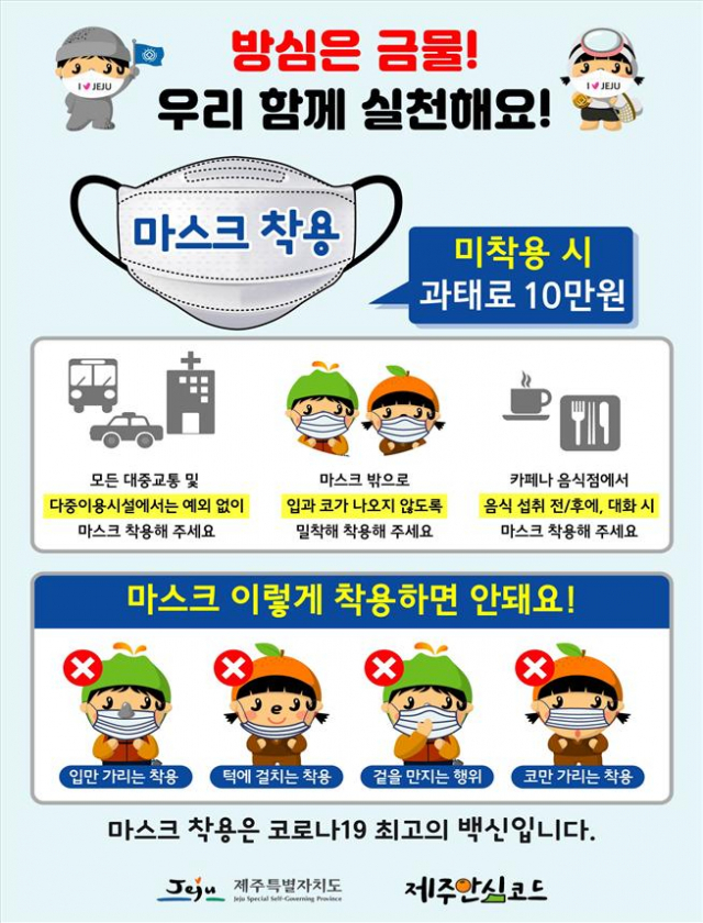 제주도는 마스크 착용 의무화에 따라 13일 0시부터 마스크 미착용 등 방역수칙 위반 시 10만원의 과태료를 부과한다고 밝혔다.