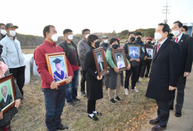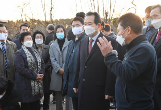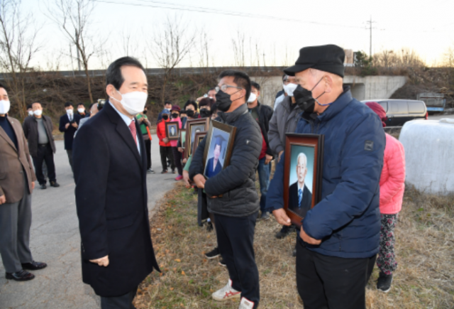 정세균 국무총리가 24일 암 집단 발병이 확인된 전북 익산 장점마을을 방문해 주민들을 위로하고 있다.