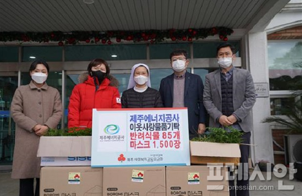 제주에너지공사(사장 황우현)는 지난 10일 제주성이시돌요양원에 반려식물과 KF 마스크 1500개를 전달했다.