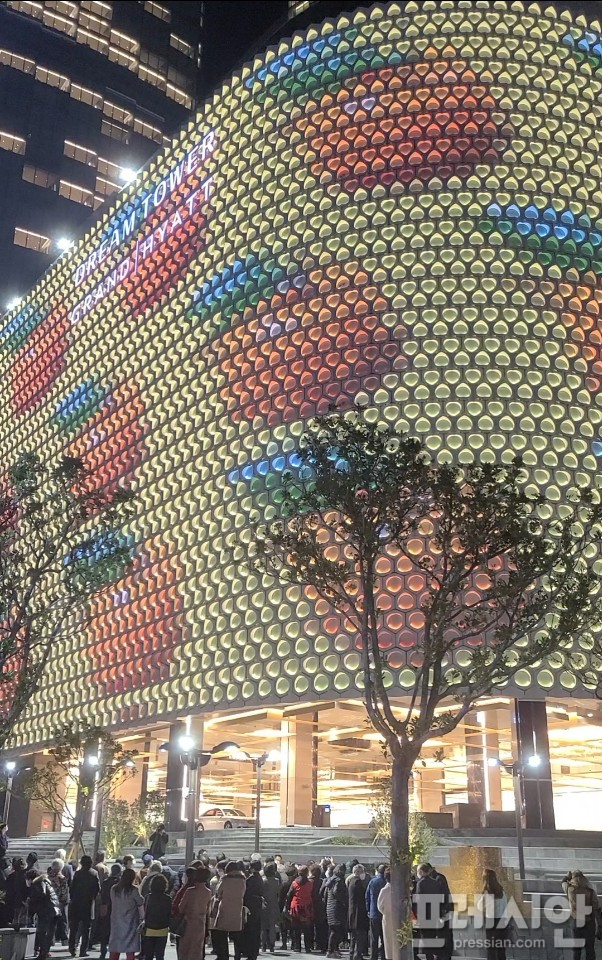 제주 드림타워 복합리조트의 미디어파사드는 가로 241m 세로 42m의 벽면 안쪽에 1만개가 넘는 LED조명이 설치돼 있는 전국 최대 규모로 270억원의 공사비가 투입됐다.