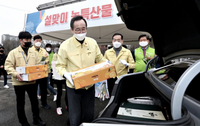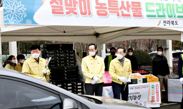 도와 전북농협이 6일 전북도청 주차장에서 함께 진행한 '설맞이 농특산물 드라이브스루' 특판행사.