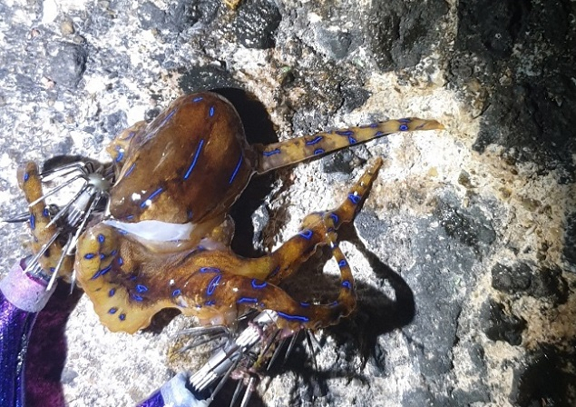 해경이 현장에 도착했을때는 문어는 죽어 있었으며 수거해 국립수산과학원에 의뢰한 결과 파란선문어로 확인됐다.