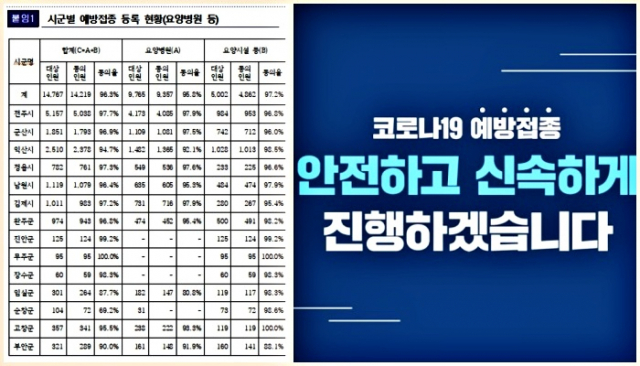 도내 시·군별 예방접종 등록 현황(요양병원 등)에서는 무주와 고창이 동의율 100%를 찍었다.