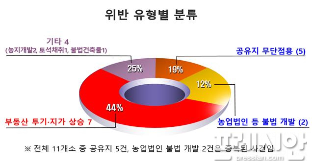 이밖에도 지가 상승을 유도한 투기행위 7건과 공유지를 자신의 재산처럼 무단 점용한 사례도 5건이나 확인돼 관련부서에 해당 사항을 전달했다.