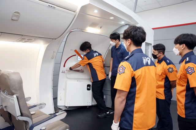 이날 교육에서 소방관들은 티웨이항공 객실승무원 훈련 교관들의 지도하에 항공 안전 업무의 이해를 시작으로 비상구 개폐 실습, 객실 화재 진압, 환자 발생 시 대처, 비상시 승객 구조 실습 등 기존 소방훈련에서 접하기 어려운 기내 상황별 대처법을 익히는 시간을 가졌다.