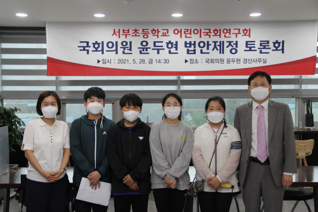 경산서부초 어린이국회 어린이의원들은 조선순 선생님의 지도로 3월부터 다양한 법률안의 발의를 준비했고, 지난 5월 28일 경산 국회의원 윤두현 의원과 법안제정 토론회를 가지며 의견을 교환하고 법률안을 가다듬었다.