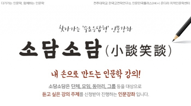전주대학교 한국고전학연구소 인문한국플러스(HK+) 온다라 지역인문학센터와 유라시아 문명교류사 모임은 10월 6일부터 11월 3일까지, 격주 수요일마다 찾아가는 수요응답형 인문강좌 '소담소담(小談笑談)'을 총 3회 실시한다.