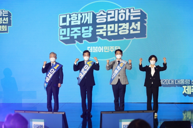 전국 순회경선에 나선 더불어민주당 대권주자들이 1일 제주에서 지역 표심 확보를 위한 합동연설회를 개최했다.