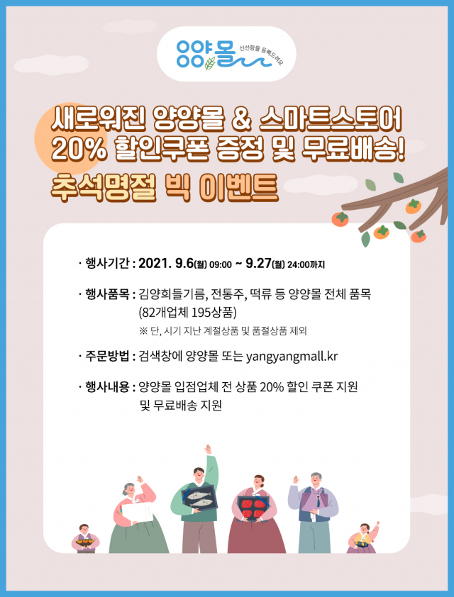 양양군은 2011년부터 직접 운영하고 있는 농가 직거래 쇼핑몰인 ‘양양몰’을 양양몰 네이버 스마트스토어로 새롭게 리뉴얼하고, 그 오픈을 알리기 위한 ‘추석명절 빅 이벤트 행사’를 진행했다.