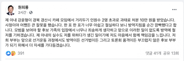 13일 원 후보는 페이스북 게시물을 통해 "경북 경산시 카페 모임에서 거리두기 인원수 2명 초과로 과태료 처분 10만 원을 받았습니다"며 "사정이야 어쨌든 큰 잘못을 했습니다. 한 표 한 표가 너무 아쉽고 절실하다 보니 방역지침을 순간 깜빡했다고 합니다. 모범을 보여야 할 후보 가족의 입장에서 너무나 죄송하게 생각하고 앞으로 이러한 일이 없도록 방역에 철저를 기하겠습니다"라고 입장을 밝혔다.