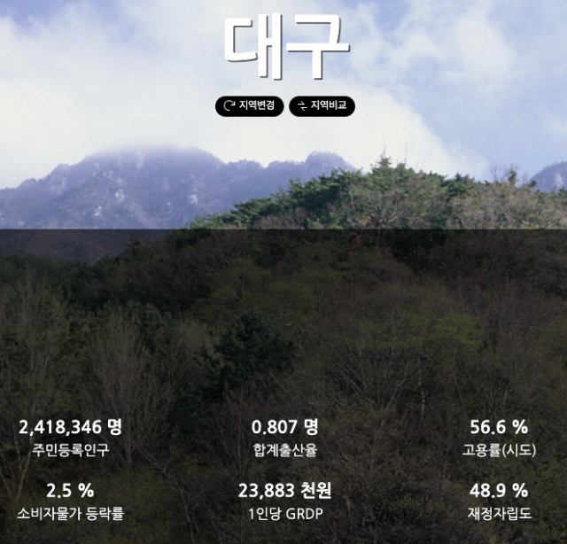 대한민국 세 번째 도시인 '대구'는 지역총생산(이하 'GRDP')이 1992년부터 26년째 전국 최하위를 기록하고 있으며, 국가통계포털(이하 'KOSIS')에 따르면 2019년 기준 1인당 GRDP의 경우 1위인 울산의 6511만 원의 약 36.7% 수준인 2388만 원에 머무르고 있다.