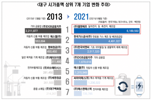 7년이 지난 2021년 9월 말 기준 53개 대구 상장기업 중 시총 1위는 2차전지 양극제를 생산하는 ㈜엘앤에프(시총 6조 1천895억)이고, 3위는 의약물질을 연구·개발 제조하는 ㈜한국비엔씨(시총 2조 5천173억), 6위에는 2차전지 등 에너지 관련 제조설비를 생산하는 씨아이에스(주)(시총 1조 2천303억)가 자리해 상위 7개 기업 중 3개 기업이 미래차(2차전지), 의료분야 기업이고, 상위 7개 기업 시가총액의 합은 18조 1천596억 원으로 2013년 말 대비 420% 이상 증가했다.