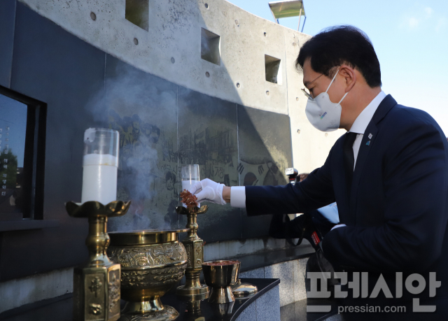 한편 송 대표는 이날 민주공원 참배 후 여당 대표로는 처음으로 순직선원 위패봉안과 합동위령제가 열리는 영도구를 방문한 이후 지난 8월 아프가니스탄 조력자 수송에 힘썼던 미라클 작전 수행부대가 있는 김해기지를 찾을 예정이다.