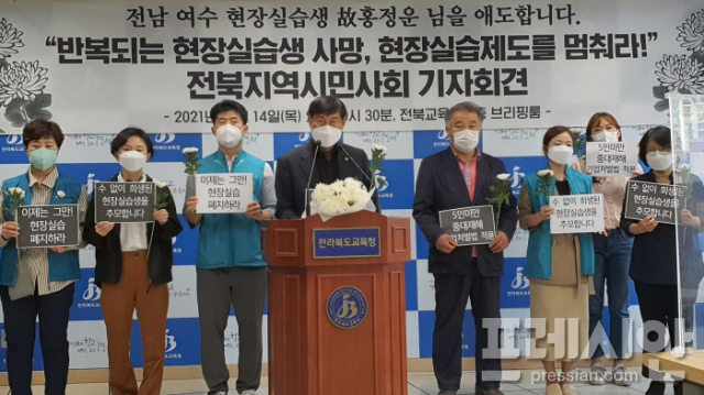 전북지역 시민사회단체로 구성된 '전북청소년노동인궈네트워크' 김정훈대표는 이날 전북교육청에서 기자회견을 갖고, 반복되는 현장실습생 사망과 관련해 "현장실습은 교육도 노동도 아니며, 교육은 교육 다워야 한다"면서 "비참한 죽음이 반복되고 있는 현장실습제도는 당장 폐지할 것"을 촉구했다.
