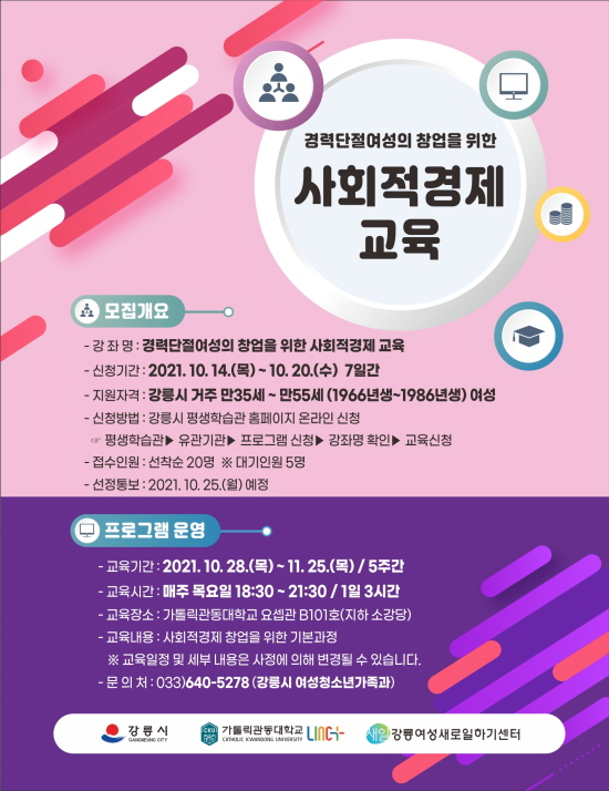 이번 교육은 강릉시와 가톨릭관동대학교 LINC+사업단, 강릉여성새로일하기센터가 공동으로 진행하며, 강릉시에 거주하는 만35세~만55세 경력단절여성을 대상으로 오는 20일까지 강릉시평생학습관 홈페이지를 통해 온라인으로 선착순 신청 가능하다.