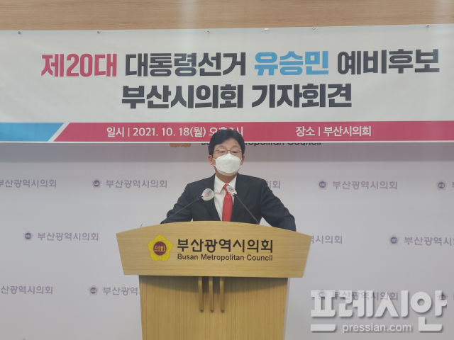 먼저 유승민 국민의힘 대선 경선 후보자는 18일 오후 2시 부산시의회 브리핑룸에서 기자회견을 열고 PK지역 공약 발표에 앞서 이날 국회 국정감사를 받고 있는 더불어민주당 대선 후보자인 이재명 경기도지사에 대한 비판을 쏟아냈다.