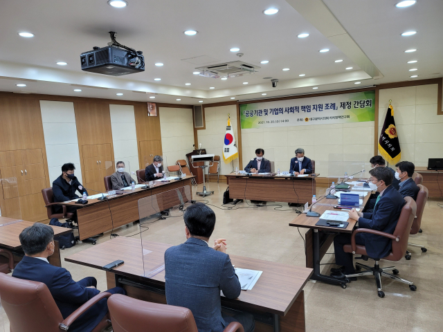 대구광역시의회의 의원연구단체 '자치정책연구회'가 20일 공공기관 및 기업의 사회적 책임 활동을 제도적으로 지원하기 위한 '조례 제정 간담회'를 시의회에서 개최했다.
