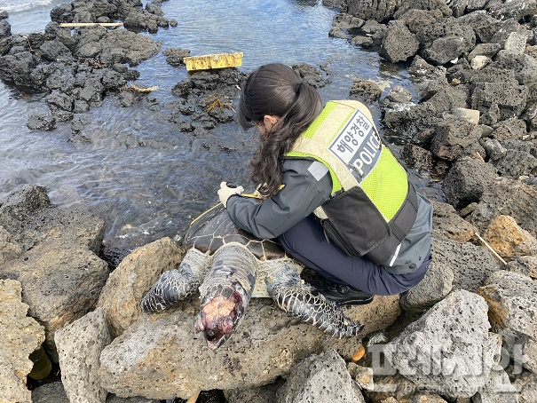 제주해양경찰서에 따르면 이날 오전 10시 19분경 북촌리 인근 해안가에 거북이 사체가 있다는 주민 신고가 접수됐다.