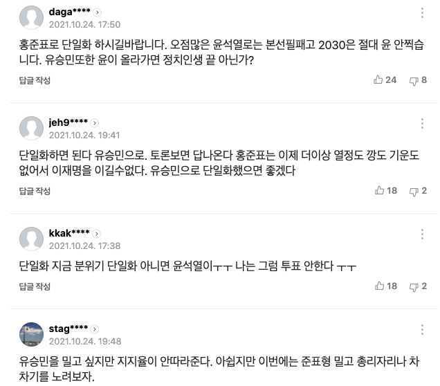 이와 관련해 포털에 네티즌들은 "홍준표로 단일화하시길 바랍니다. 오점 많은 윤석열로는 본선 필패고 2030은 절대 윤 안 찍습니다. 유승민 또한 윤이 올라가면 정치인생 끝 아닌가?"라고 댓글을 달았다.