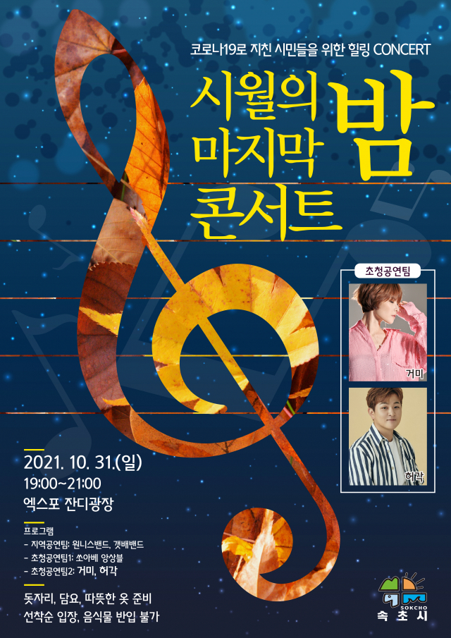 강원 속초시(시장 김철수)는 코로나19로 지친 시민과 관광객에게 힐링의 시간을 선사하기 위해 ‘시월의 마지막 밤 콘서트’를 오는 31일 저녁 7시부터 엑스포 잔디광장에서 개최한다고 26일 밝혔다.