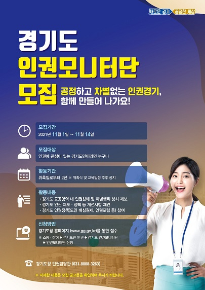 경기도가 '인권 경기' 구현을 위해 '제2기 경기도민 인권모니터단'을 기존 30명에서 1000명으로 대폭 확대하기로 하고, 도민 666명을 공개 모집한다고 27일 밝혔다.