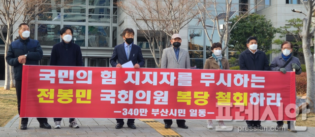 이날 오후에는 부산시청 앞 광장에서 '부산을 사랑하는 사람들'이라는 이름을 내건 한 시민단체도 "전봉민 의원을 복당시킨 이유가 도대체 무엇인가. 도둑복당에 이어 부울경 선대본부장으로 임명을 했다 하니 기가 차고 코가 막힌다"고 반발했다.