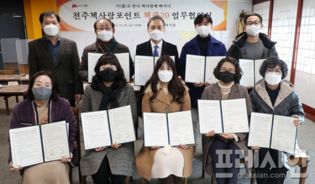 지난달 31일 전주시는 김승수 시장과 송천동 꿈아이서점을 비롯해 전주책사랑포인트에 신규 가입한 8개 지역서점의 대표가 참석한 가운데 ‘전주책사랑포인트 책쿵20’ 운영 업무협약을 체결했다.