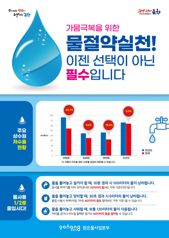 포항시는 최근 심각한 가뭄 상황을 극복과 가뭄 피해를 줄이기 위해 대대적인 물 절약 캠페인을 펼치고 있다.