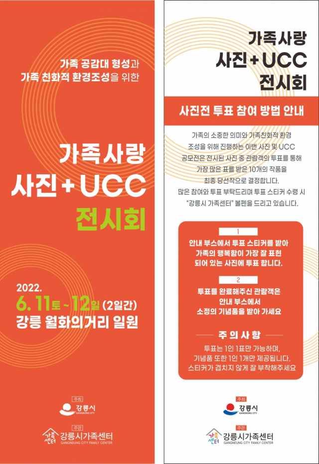 강릉시 가족센터는 가족 공감대 형성과 가족 친화적 환경조성을 위한 '가족사랑 사진+UCC 전시회'를 오는 11일부터 12일까지 월화거리에서 전시 및 관람할 수 있게 진행한다.