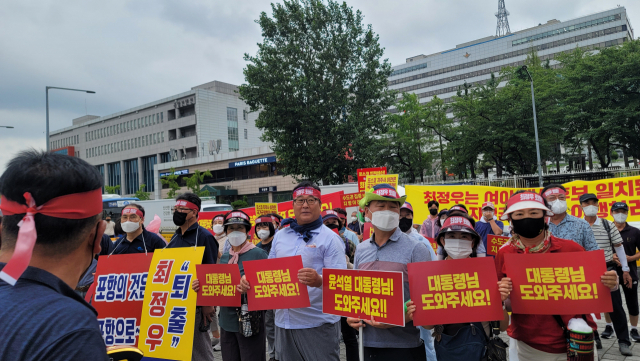 이날 집회는 용산 대통령 집무실 앞과 서울 포스코센터 앞에서 대국민 호소문 낭독에 이어 구호 제창 순으로 진행됐다.
