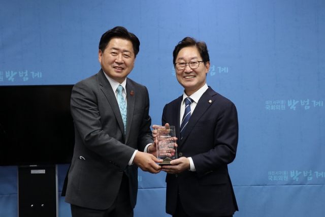 오영훈 지사는 4일 오후 서울 여의도 국회에서 박범계 국회의원(더불어민주당·대전 서구을)에게 명예도민증을 전달했다.