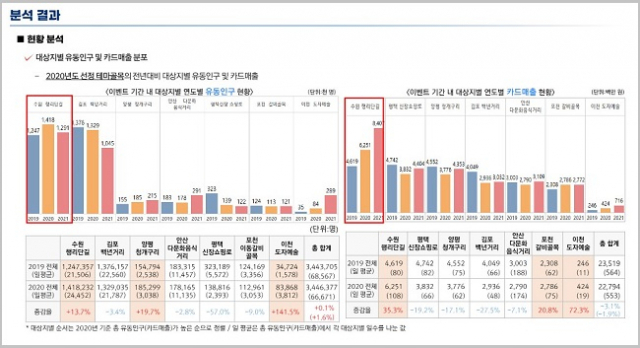 지난해 경기바다 여행주간에 선정된 김포바다와 시흥바다는 유동 인구가 2020년보다 각각 47.6%, 19.1% 늘었고, 화성바다는 유동 인구는 22.5% 줄어든 반면 카드 매출은 25.3% 증가했다.