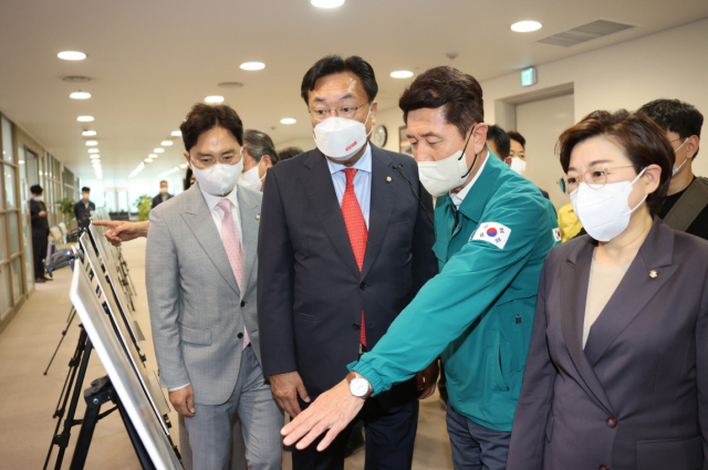 국민의힘 정진석 비상대책위원장이 13일 제11호 태풍 ‘힌남노’로 큰 피해를 입은 경북 포항시청을 방문해 이강덕 포항시장으로부터 태풍 피해 현황을 보고받고 “피해 주민에 대한 실효적인 지원 방안을 마련하겠다”고 밝혔다.