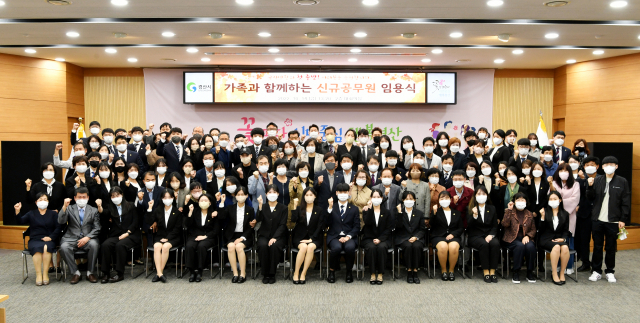 경북 경산시(시장 조현일)가 지난 14일 시청 대회의실에서 '가족과 함께하는 신규공무원(46명) 임용식'을 개최했다.