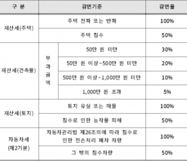 현재 지방세 관계법령에 따라 멸실·파손된 건축물, 차량, 선박, 기계장비를 건축·개수하거나 대체취득하는 경우에 멸실·파손일로부터 2년 이내 취득세 및 등록면허세를 면제할 뿐만 아니라, 침수 차량에 대해 차량 침수일부터 차량 폐차일까지 자동차세를 감면해주고 있다.