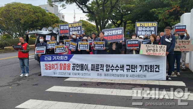 민주노총제주본부와 제주주권연대, 제주녹색당 등 9개 단체와 정당은 10일 제주경찰청 앞에서 공동 기자회견을 열고 강 전 위원장에 대한 무리한 압수수색이 최근 정부여당에게 불리해지고 있는 참사 정국을 모면하기 위한 기획수사가 아닌 지 의심이 든다고 밝혔다.