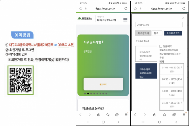 파크골프장 예약은 대구시 파크골프예약시스템에서 회원가입 후 가능하며, 별도의 어플리케이션 설치 없이 모바일에서도 동일한 이용이 가능하다.