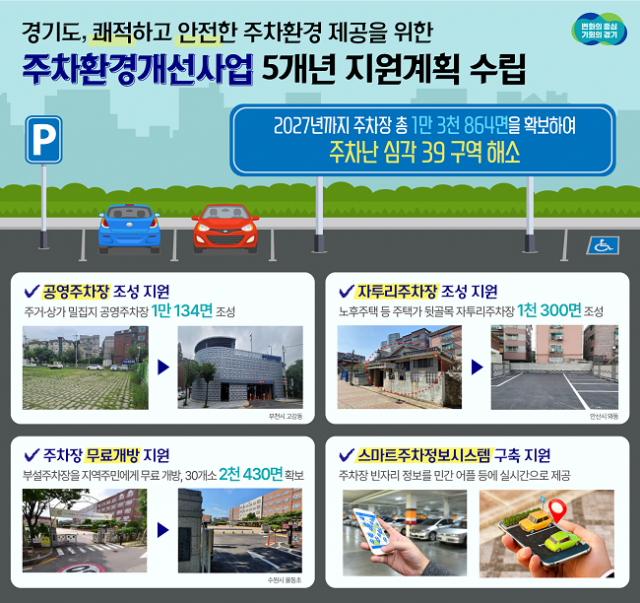경기도가 도정 현안 중 하나인 주차난 해결을 위해 2027년까지 3651억원을 투입, 1만 3864면의 주차 공간을 확보하고 스마트주차정보시스템 구축을 지원한다.